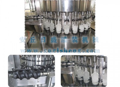 瓶子與灌裝閥上下方向不運動,故障率極低:彈性定位夾同時卡住瓶身,瓶脖,使閥口瓶口準確對中定位:高速液柱快速準量灌裝、工作穩(wěn)定可靠。