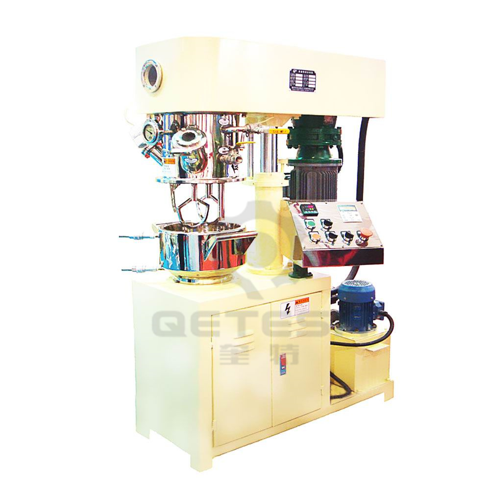 雙行星混合機(jī)的攪拌槳葉,在公轉(zhuǎn)的同時(shí)也自轉(zhuǎn),使罐體內(nèi)物料上下及四周循環(huán)運(yùn)動(dòng),從而可在很短時(shí)間內(nèi)達(dá)到混合(混煉)效果。罐體內(nèi)壁為大型立車精加工,再經(jīng)大型拋光機(jī)自動(dòng)拋光,確保行星箱上的活動(dòng)刮刀在旋轉(zhuǎn)時(shí),把罐體內(nèi)壁上的物料完全刮掉。該機(jī)特別適合從粉體到高黏度、高密度的物料溶解、混合、混煉、反應(yīng)工藝。廣泛應(yīng)用于電池、有機(jī)硅膠、油墨、染料、粘膠劑、高粘度涂料等化工產(chǎn)品。